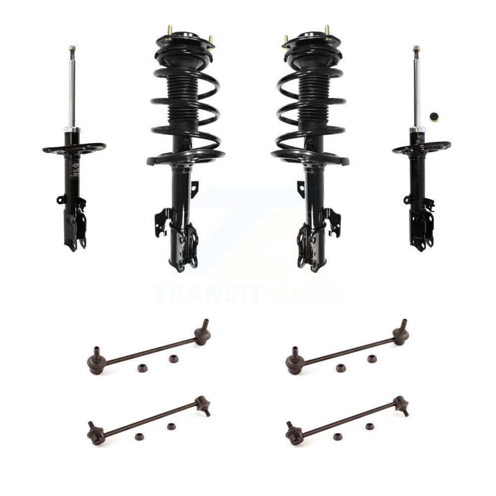 - Kit Includes: 2x Front Unity Automotive Suspension Strut and Coil Spring Assembly (Both Side) + 2x Front TOR Suspension Stabilizer Bar Link Kit (Both Side) + 2x Rear TMC Suspension Strut (Both Side) + 2x Rear TOR Suspension Stabilizer Bar Link Kit (B