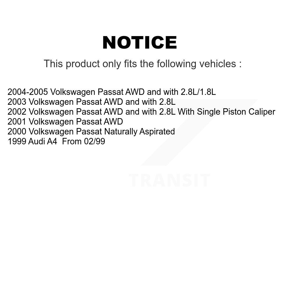 | 2002 | Volkswagen | Passat | All | With Single Piston Caliper | All | AWD | 2.8 | All |