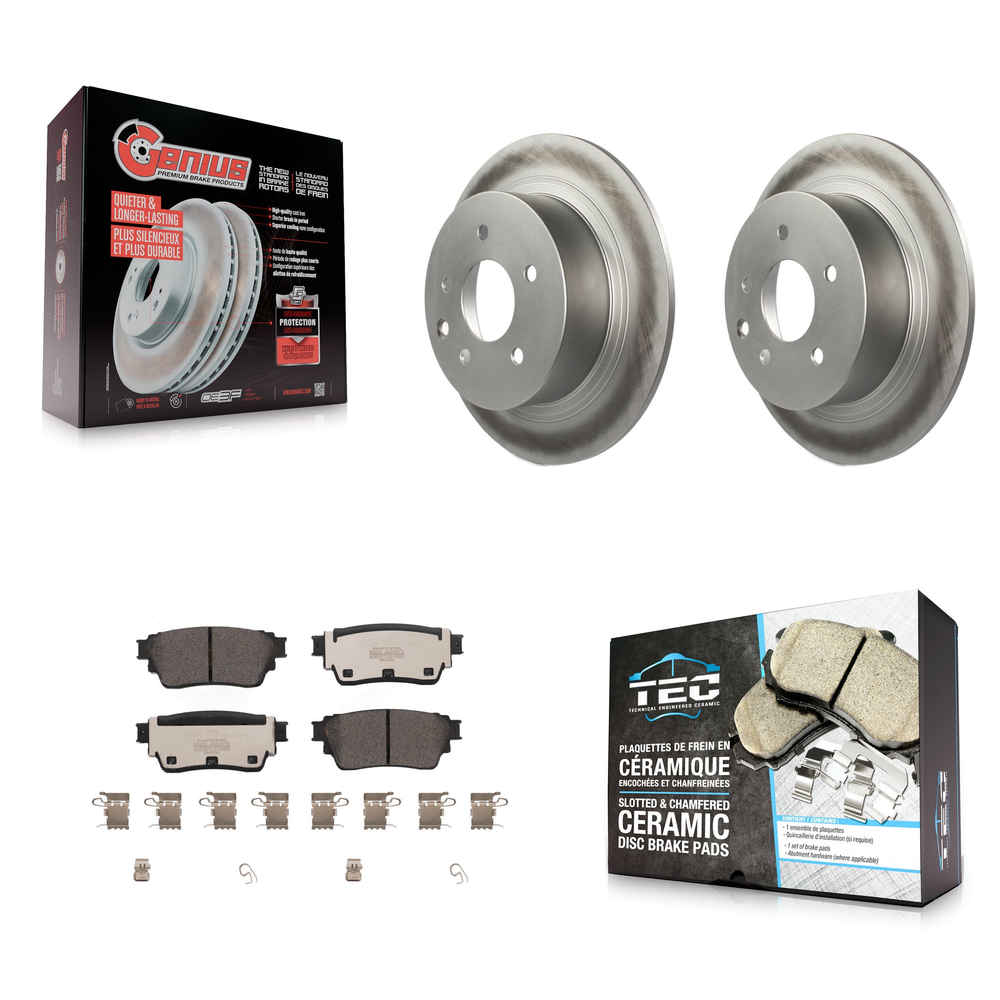 • INCLUDES: 2x Rear Coated Genius Disc Brake Rotor (Both Side) + 1x Rear Ceramic TEC Brake Pad Set (Hardware Included)